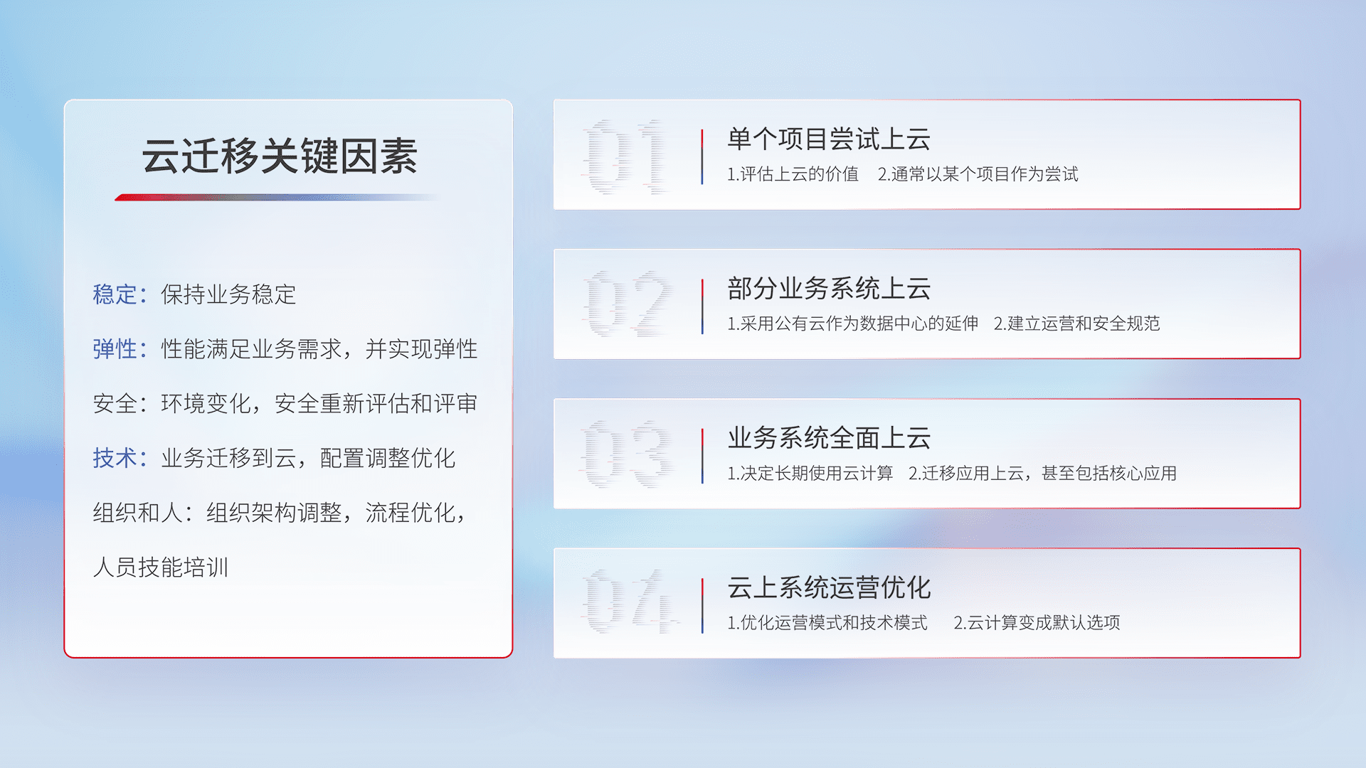 结合实际业务,,从规划设计、、、云平台选型、、云原生改造、、数据迁移、、、、集成交付,,,,迁移全过程为客户识别最佳上云路径,,,做好风险识别管理,,设计网络架构、、、、身份权限、、、安全审计合规、、、、操作审计、、、日志审计、、、、监控告警策略、、、、多站点容灾设计等,,,对云上基础设施进行整体规划,,,提升IT治理水平,,以满足弹性、、、、高可用、、、、高性能的需求。。