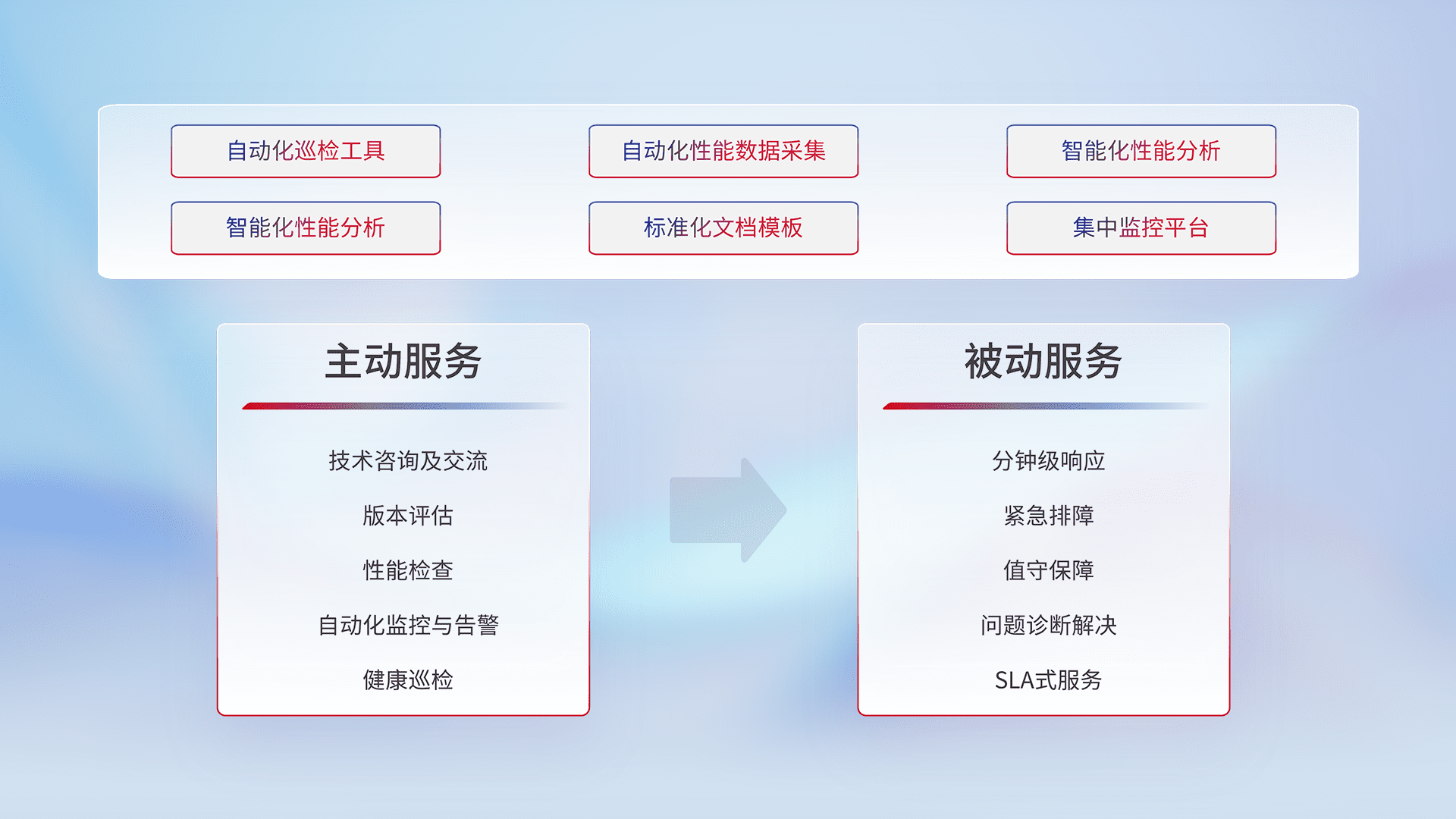 智能化工具和标准化文档,,保障服务质量,,提供主动服务(包含技术咨询、、版本评估、、、、性能检查、、、、自动化监控与告警、、健康巡检)和被动服务包含(分钟级响应、、、、紧急排障、、、值守保障、、、、问题诊断解决、、、、SLA服务)。。。。